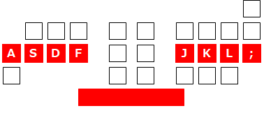 図に示しているように、ASDF JKL; の8つのキー位置に、左右の親指以外の指を載せてください。